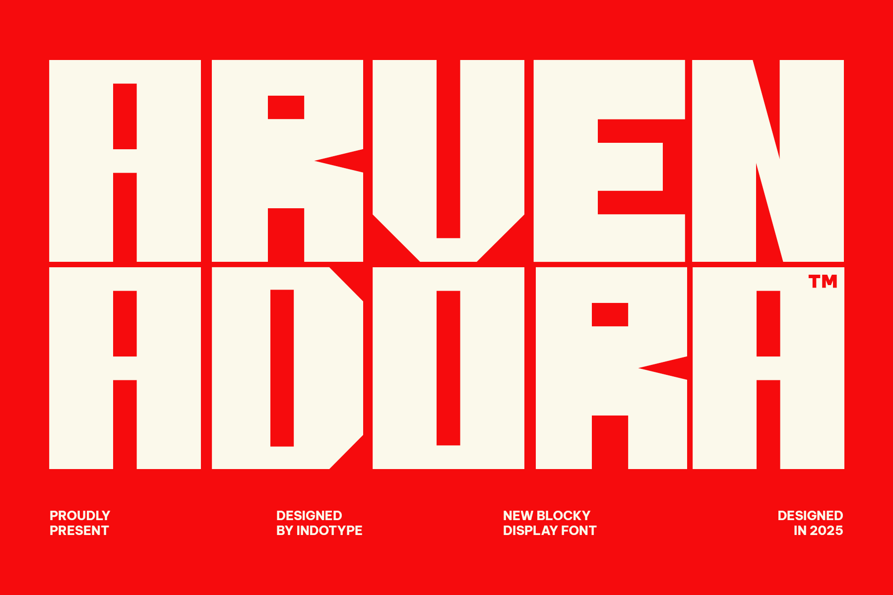 Arvenadora is a bold blocky display font that commands attention with its geometric structure and powerful presence. Featuring sharp angles, rigid proportions, and impactful forms, this typeface is designed for projects that require strength, authority, and clarity. Its block-like letterforms make Arvenadora ideal for headlines, posters, sports branding, logos, signage, and modern digital graphics. Every character is designed to deliver maximum impact, ensuring that your message stands out loud and clear. With multilingual support and a complete glyph set, Arvenadora provides flexibility across diverse languages and design needs. Designed by Indotype in 2025, this font isn’t just a typeface — it’s a bold statement for daring designers.