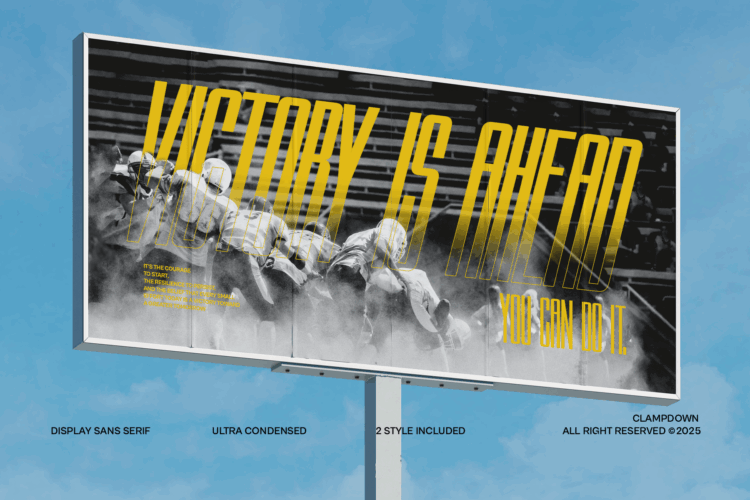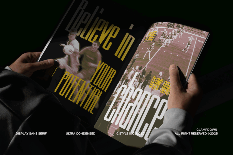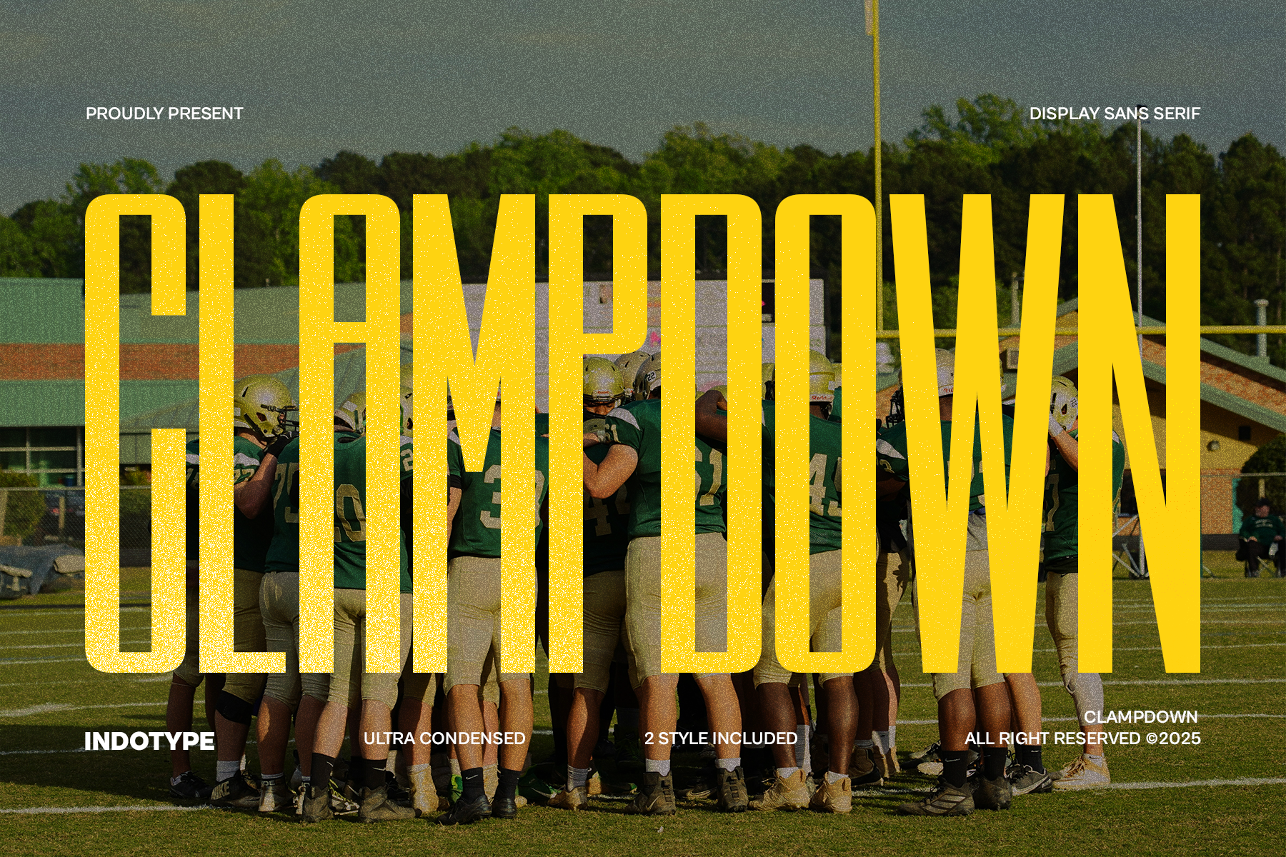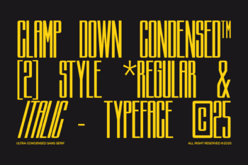 Clampdown is a striking ultra-condensed sans serif display font designed to deliver maximum impact in minimal horizontal space. With its tall, bold letterforms and strong vertical emphasis, Clampdown commands attention and ensures that every word stands out with authority. This typeface is ideal for posters, sports graphics, editorial headlines, branding projects, event promotions, and bold statement designs where space is limited but style cannot be compromised. Its narrow proportions make it perfect for creating powerful typography that feels modern, dynamic, and intense. Featuring 2 styles for added flexibility, Clampdown adapts effortlessly to a variety of creative needs. Whether you’re designing for athletic campaigns, music promotions, fashion branding, or high-energy advertising, this font brings boldness and clarity to the forefront.