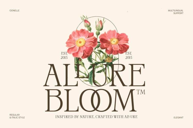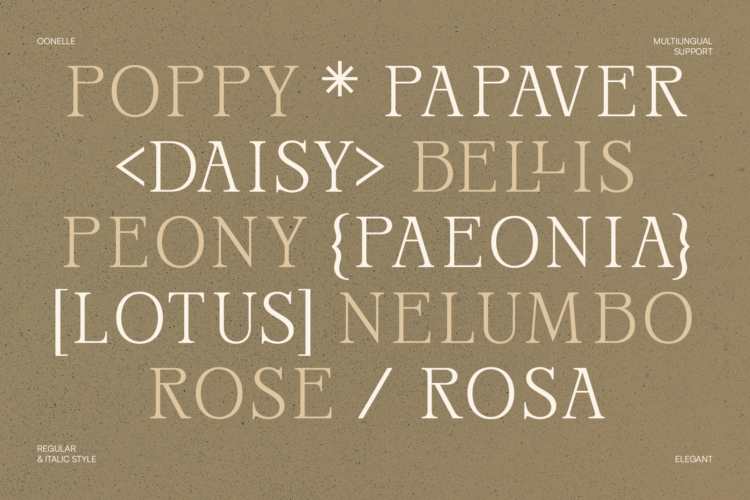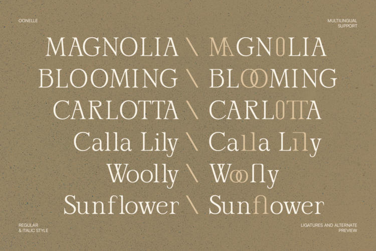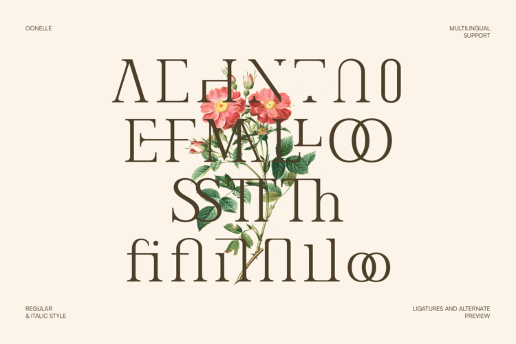 Oonelle is an elegant serif display typeface crafted for refined visual storytelling. Its timeless letterforms balance graceful curves and crisp structure, exuding a sense of sophistication that feels both modern and classic. Designed with 7 alternates and 11 ligatures, Oonelle offers expressive versatility, allowing each word to flow beautifully across layouts. Featuring regular and italic styles with 200+ glyphs and full multilingual support, Oonelle is perfect for editorial design, branding, invitations, and luxury packaging. The overlapping “O” detail in its logo presentation captures its essence — unity, elegance, and artistic poise. Published by Indotype in 2025, Oonelle transforms typography into a refined visual statement — ideal for those seeking a high-fashion, magazine-style, and timeless serif aesthetic that radiates confidence and beauty.